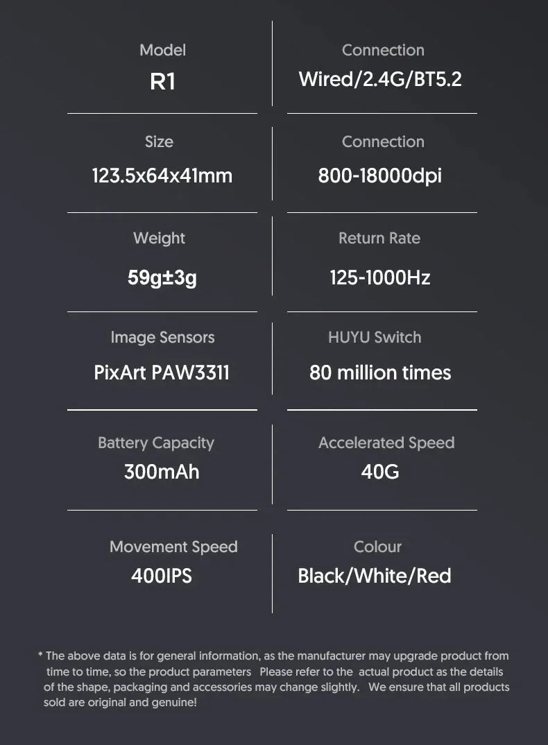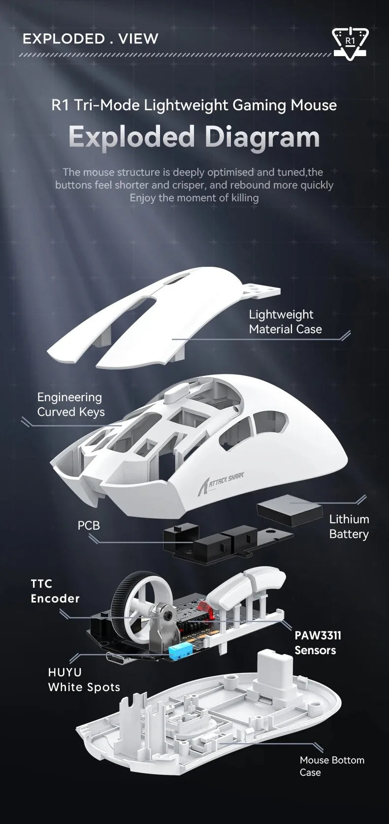 ----High Sensor Resolution :Experience seamless gaming with the Attack Shark R1 wireless mouse, featuring a PAM3311 sensor and a 1000Hz return rate for precision control.